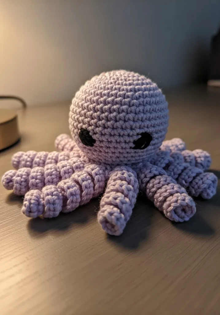 This tiny crochet octopus is made with plush lavender yarn and tightly stitched for a smooth, rounded body. Eight short curly tentacles spread out evenly, giving it that classic amigurumi look. The small embroidered eyes add just the right amount of personality without overwhelming the design. The soft texture makes it perfect for little hands or as a cute desk buddy.