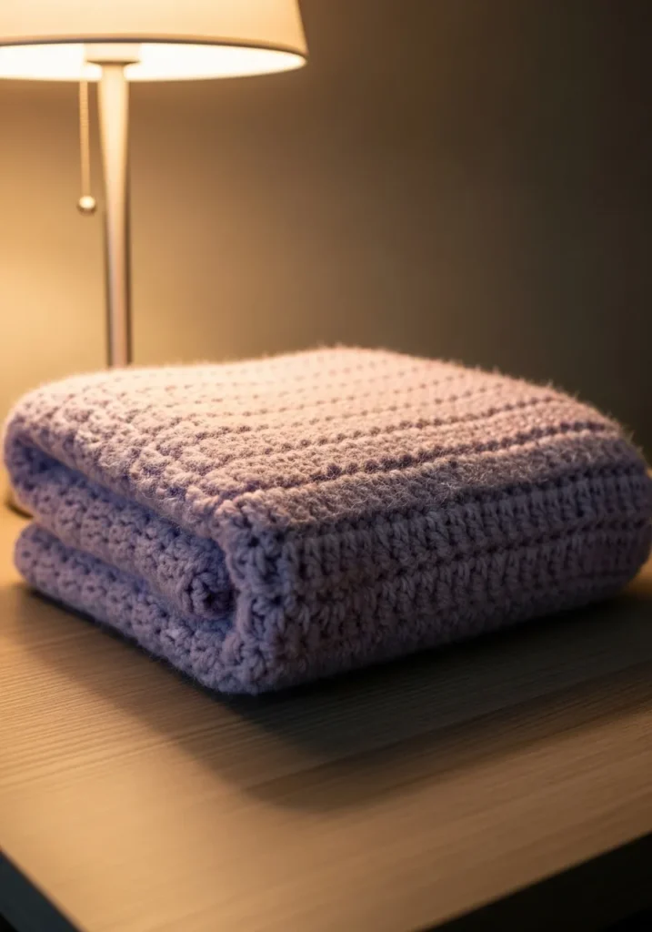 This chunky folded blanket is the definition of comfort with its soft lilac hue and thick squishy texture. It looks like it was made with a high-quality wool blend or a premium acrylic yarn that gives it that slightly fuzzy halo and incredible warmth. The design keeps things beautifully simple by using basic stitches like the half double crochet or double crochet, which creates those lovely, defined ridges and a dense fabric perfect for chilly nights. Its minimalist style means it fits right in with any home decor, from a modern bedroom to a rustic reading nook.
