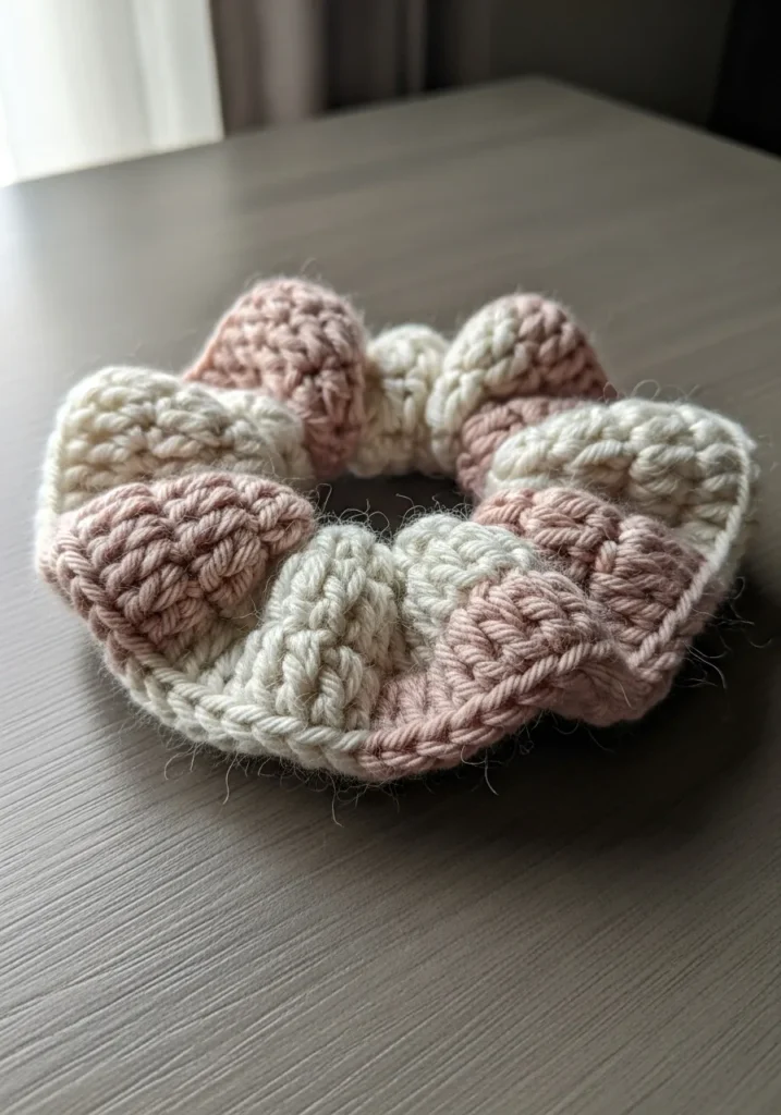 This charming handmade accessory features a beautiful alternating pattern of soft cream and dusty rose yarn. The texture is wonderfully chunky because it is worked with a thicker weight yarn that gives those ruffled edges a playful and voluminous bounce. Its design is classic yet cozy, with the stitches looking plump and well defined against the elastic core. The matte finish of the wool blend provides a rustic and tactile feel that is far gentler on your hair than a standard store-bought tie.