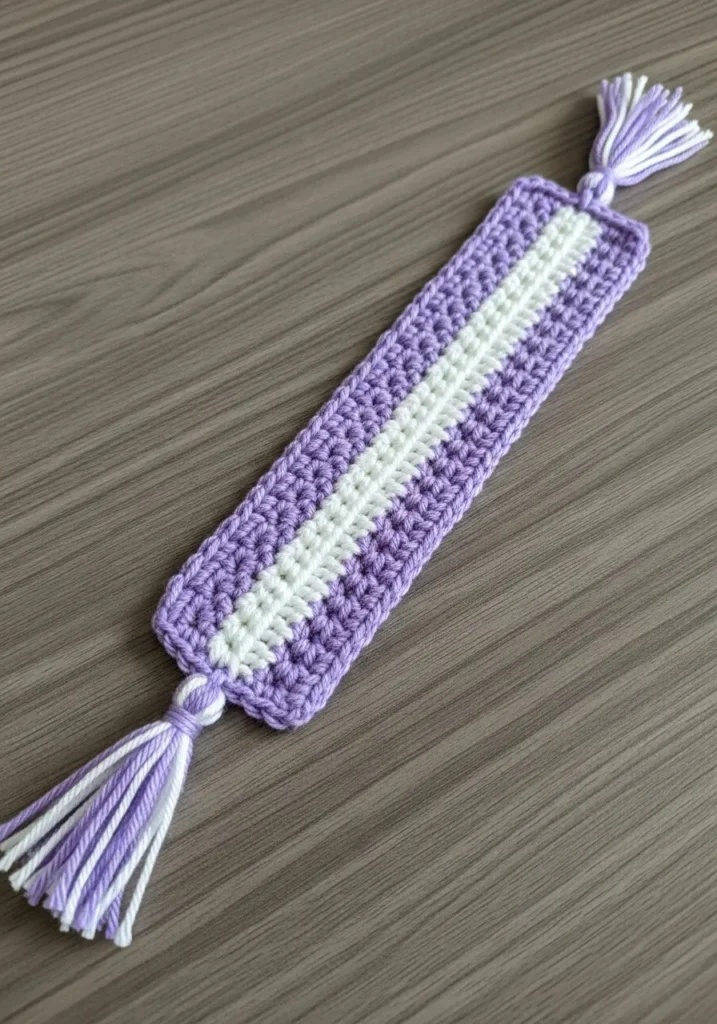 This charming bookmark features a classic three-stripe design using a soft lavender purple and a crisp white yarn. The texture is created with tight, neat single crochet stitches that give the piece a sturdy yet flexible feel. It is finished off with two thick, fluffy tassels on either end that combine both yarn colors for a playful look. The rectangular shape is perfectly balanced, making it a stylish and practical accessory for any paperback or hardcover book.