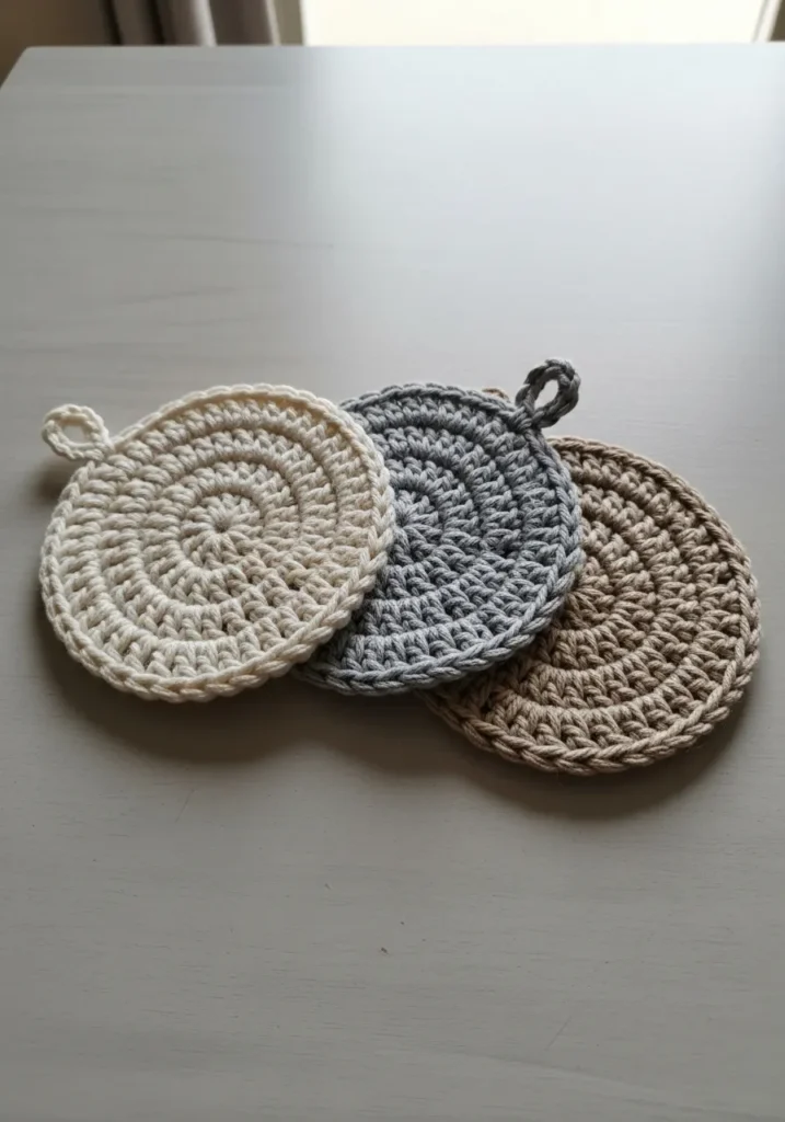 These circular potholders are a masterclass in understated elegance and practical design. Crafted from thick, sturdy cotton yarn in soft oatmeal, cool slate grey, and warm taupe, they feature a dense spiral of double crochet stitches that provides excellent heat protection. The texture is wonderfully tactile with a chunky, ribbed feel that gives them a rustic yet modern farmhouse vibe. Each piece is finished with a simple integrated loop at the top, making them just as easy to hang as decor as they are to use for a hot morning coffee or a fresh pan of brownies.
