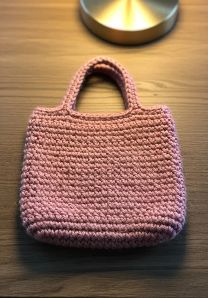 This adorable little bag features a sturdy construction made with a thick, chunky yarn in a soft dusty rose hue. The texture is wonderfully tactile, showcasing rows of tight single crochet stitches that give the piece a structured yet cozy feel. Its compact design includes two reinforced handles integrated seamlessly into the top edge, creating a classic tote silhouette that is perfect for carrying small essentials like a phone, keys, and a favorite lip balm. The matte finish of the wool blend adds a sophisticated touch to the overall handmade aesthetic.