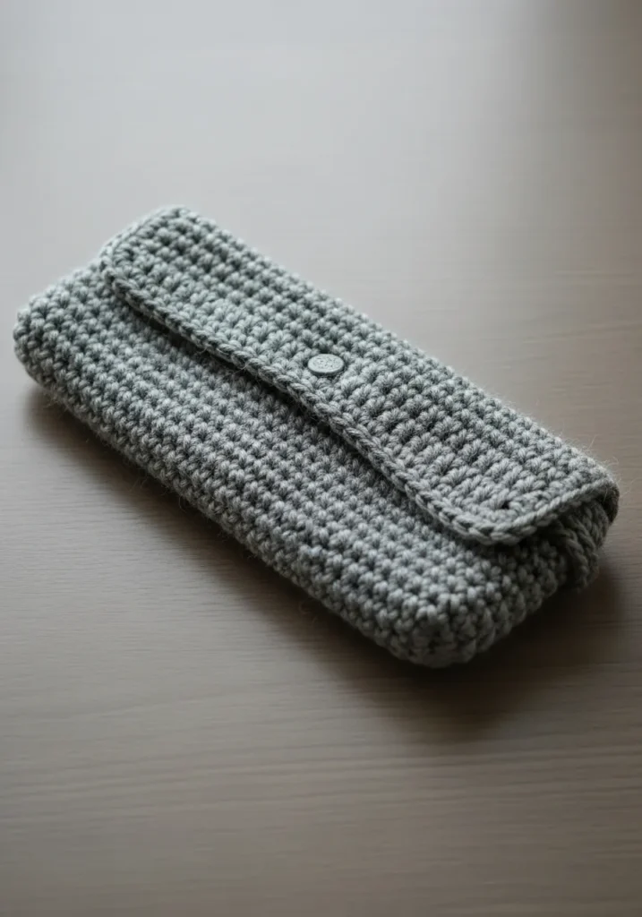 This sleek grey clutch is the ultimate example of how simple stitches can create a high-end look. The design features a thick and sturdy texture achieved with a tight single crochet stitch, giving it enough structure to hold its shape without needing a complex liner. The cool charcoal yarn has a lovely soft heathered finish that feels wonderful in your hands. A single matching button keeps everything secure and adds a tiny touch of hardware that makes the whole piece look professionally finished. It is a clean and modern accessory that works just as well for a coffee date as it does for organizing your favorite pens or crochet hooks.