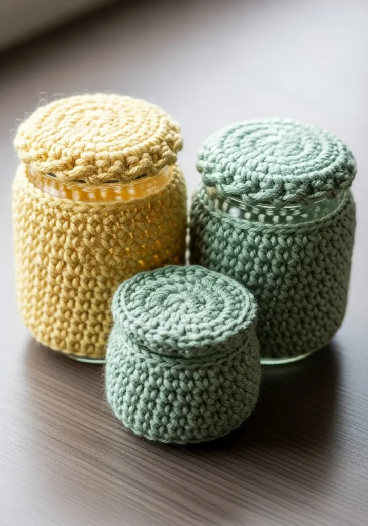 These charming crochet cozies bring a soft and earthy vibe to standard glass storage jars. Worked in a beautiful palette of sage green and buttery mustard yellow, the design features a thick and chunky single crochet stitch that adds wonderful tactile interest. The set includes snug covers for the jar bodies and matching circular toppers that fit perfectly over the lids. The yarn has a matte and slightly rustic texture, which complements the smooth glass underneath and creates a cozy, uniform look for a pantry or craft room shelf.