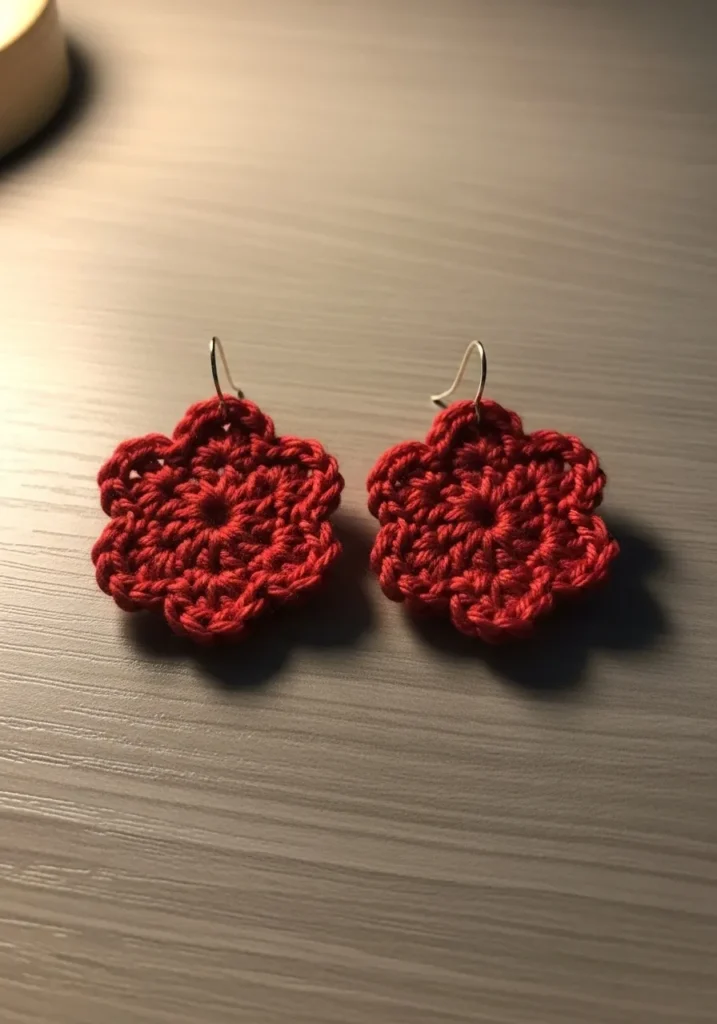These dainty crochet earrings feature a vibrant ruby red hue and a classic six-petal flower design that pops beautifully against any skin tone. Crafted with a fine cotton thread or embroidery floss, the texture is dense yet delicate, showcasing intricate stitches that form a sturdy and lightweight accessory. Each earring is finished with a simple silver hook, making them a perfect blend of handmade charm and wearable elegance. The deep crimson color gives them a bold, sophisticated look while the soft yarn petals keep the overall vibe cozy and approachable.