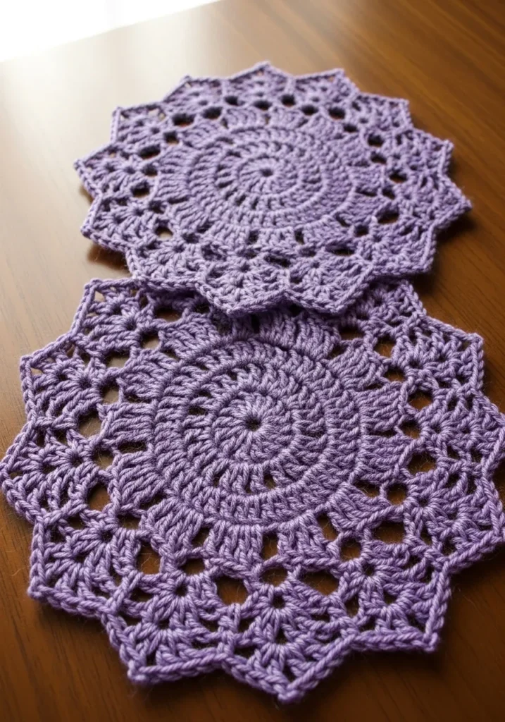 These intricate lavender doilies bring a touch of vintage charm to any tabletop with their beautiful starburst geometry. Crafted using a fine cotton thread or a light sport-weight yarn, the texture is remarkably crisp and defines every delicate petal-shaped point along the edge. The design radiates outward from a tight center into swirling rounds of double crochets and open lace windows, creating a balanced look that feels both sturdy and airy. The soft purple hue adds a modern pop of color to the classic circular motif, making these pieces stand out as functional art for a bedside table or a vanity.