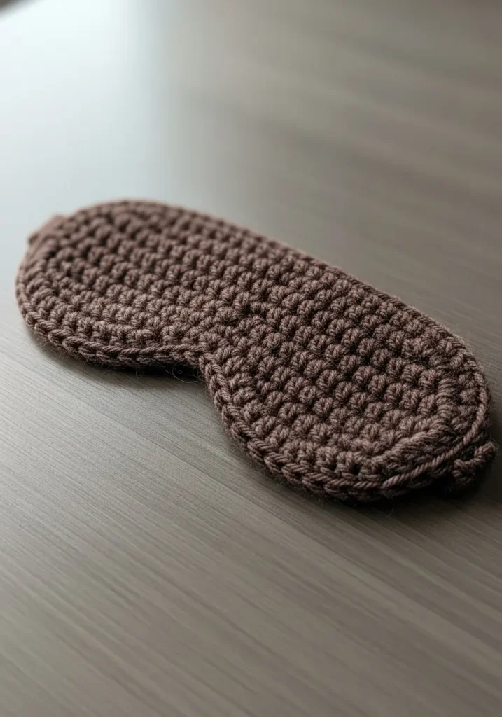 This adorable sleep mask is worked up in a rich chocolate brown cotton yarn that feels incredibly soft against the skin. The design features a classic contoured shape with rounded edges and a slight dip for the bridge of the nose to ensure total darkness for your beauty rest. Its texture is dense and smooth, thanks to the tight single crochet stitches, giving it a high-quality, handmade feel that looks much more expensive than it actually is. The matching crochet strap is elastic enough to be comfortable without pulling on your hair, making it a perfect functional accessory for your bedside table.