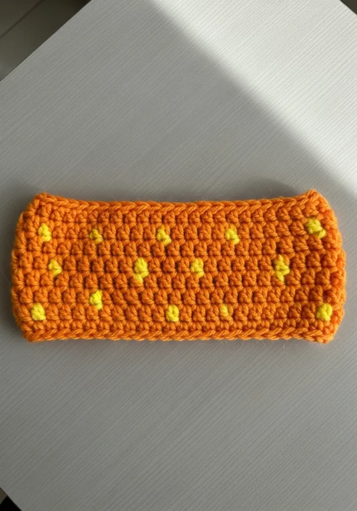 This vibrant orange headband is the ultimate cozy accessory for those chilly transition days. It features a sturdy yet stretchy texture created with simple crochet stitches and is playfully accented with sunny yellow polka dots worked directly into the pattern. The yarn looks like a soft acrylic or wool blend that provides plenty of warmth without being too bulky. With its bright color palette and clean edges, it manages to look both retro and modern at the same time.
