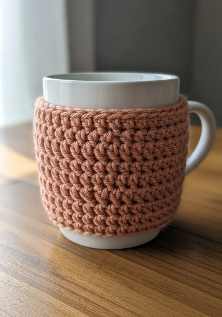 This dusty rose mug sleeve is the ultimate companion for your favorite ceramic cup. It features a thick and squishy texture created with a series of sturdy single crochet stitches that wrap perfectly around the mug. The warm terracotta hue feels incredibly earthy and grounded against the crisp white porcelain. With those neat and braided-looking edges at the top and bottom, the design looks polished while still keeping that cozy, handmade charm. It is a simple rectangular piece that joins under the handle, making it as functional as it is cute.