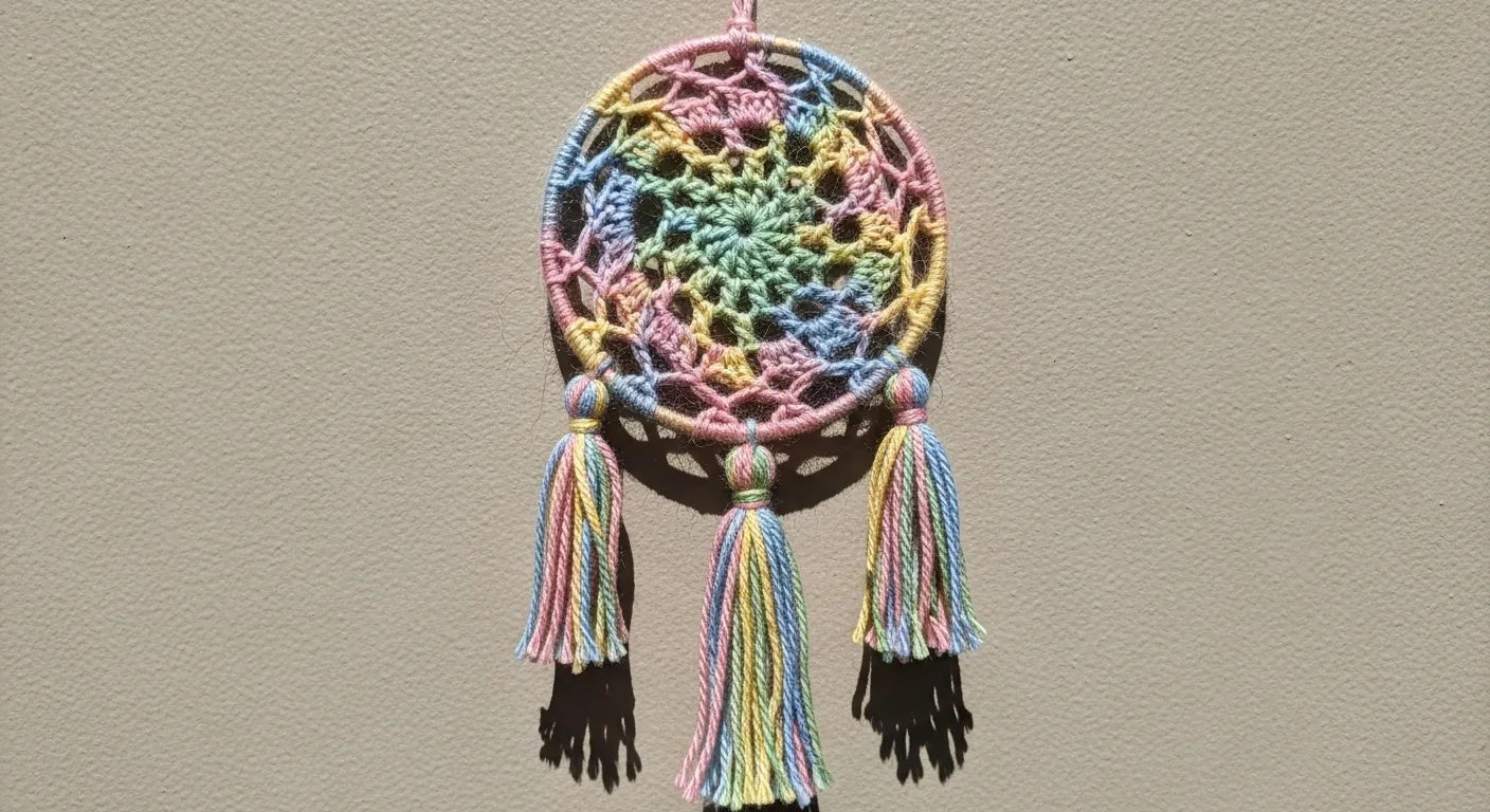 This whimsical wall hanging features a delicate crochet mandala center stretched tightly within a hoop that is wrapped in soft mint yarn. The color palette is a dreamy mix of pastel mint, sky blue, and dusty rose, giving it a very soft and ethereal vibe. The center starts with a tight floral starburst and expands into airy stitches that allow light to pass through beautifully. Long, flowing yarn fringe hangs from the bottom in alternating colors, cut into a graceful V-shape to add movement and texture to any room. It feels incredibly soft to the touch and brings a peaceful, handmade aesthetic to a bedroom or a cozy nursery nook.