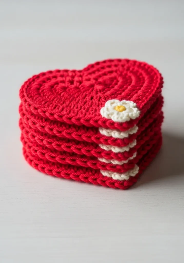 These adorable coasters feature a vibrant cherry red yarn that really pops against any coffee table. The design is a classic heart shape worked in thick, sturdy stitches to keep your surfaces safe from heat. Each one is finished off with a tiny white daisy accent, which adds a touch of cottagecore charm to the set. I love how the ribbed edges give them a bit of height and a professional, handmade look.