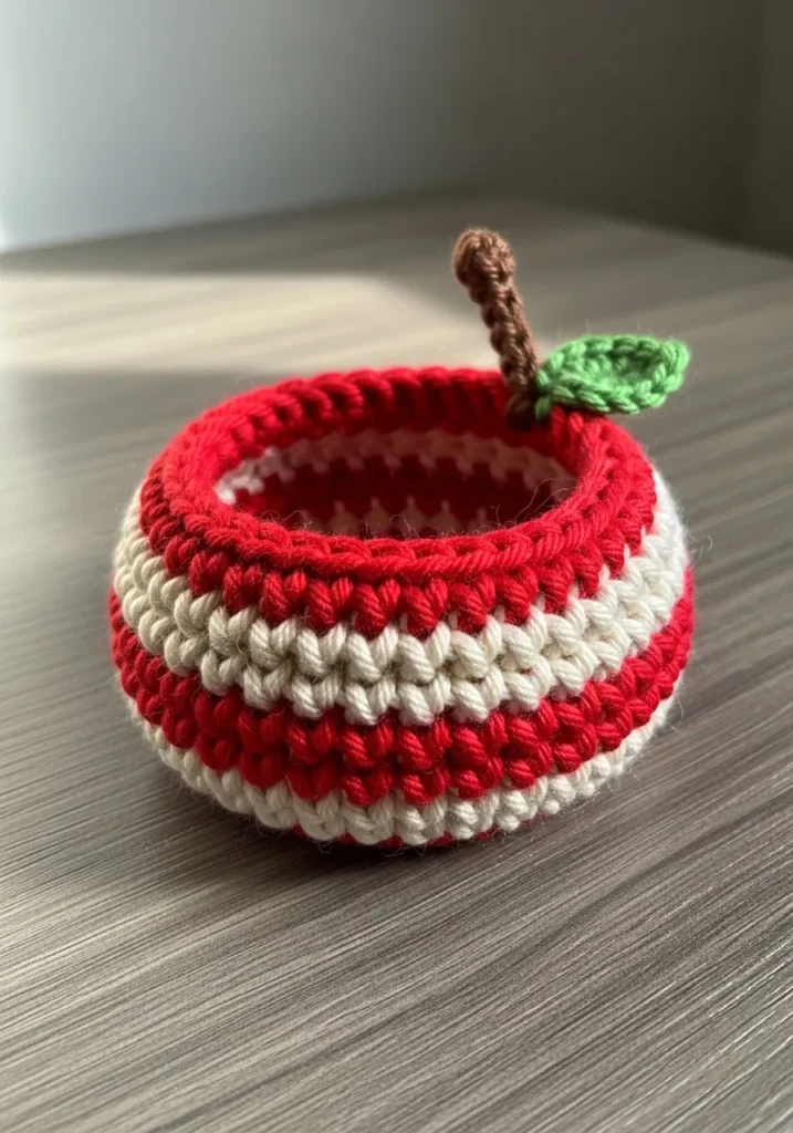 This darling little bowl is shaped just like a ripe apple and features bold stripes of cherry red and crisp white yarn. The circular design is worked in dense and sturdy stitches that help the sides stay perfectly upright so it can hold all your tiny treasures. It even has a little brown textured stem and a single bright green leaf sprouting from the rim for a touch of realistic fruit flair. The yarn has a smooth and clean finish, which makes the color changes look super sharp and professional.