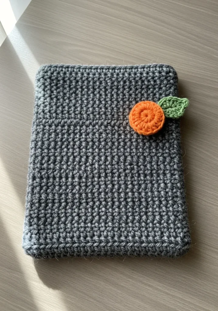 This sleek tech accessory is whipped up in a sophisticated granite grey yarn that feels modern and incredibly soft. The stitch pattern is remarkably dense and uniform, creating a thick cushioned layer that protects your screen from scratches while you’re on the move. A tiny citrus orange swirl with two minty green leaves is attached to the upper corner, breaking up the neutral tone with a delightful pop of color. It has a slightly fuzzy texture that makes it super comfortable to hold, and the overall rectangular shape is perfectly tailored for a snug and secure fit.