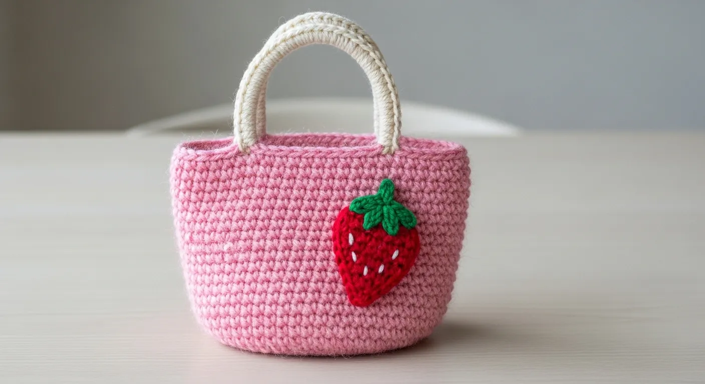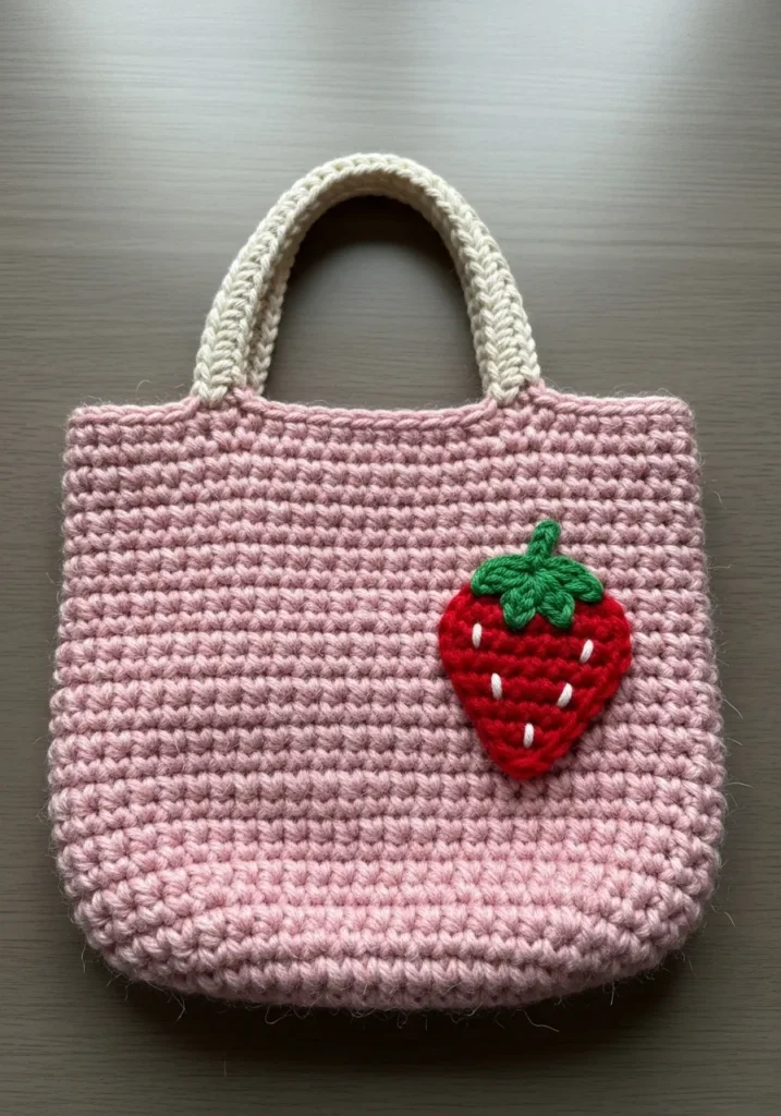This delightful handbag is stitched in a soft, dusty rose yarn that gives it a warm and gentle appearance. The body of the bag features a chunky, textured weave that provides excellent durability and a bit of weight, while the sturdy cream handles are braided for a comfortable grip. Attached to the front is a vibrant strawberry applique, complete with tiny white “seeds” and a lush green leafy top that really pops against the pink background. Its rounded rectangular shape is both classic and functional, offering enough space for your daily essentials while looking absolutely precious.