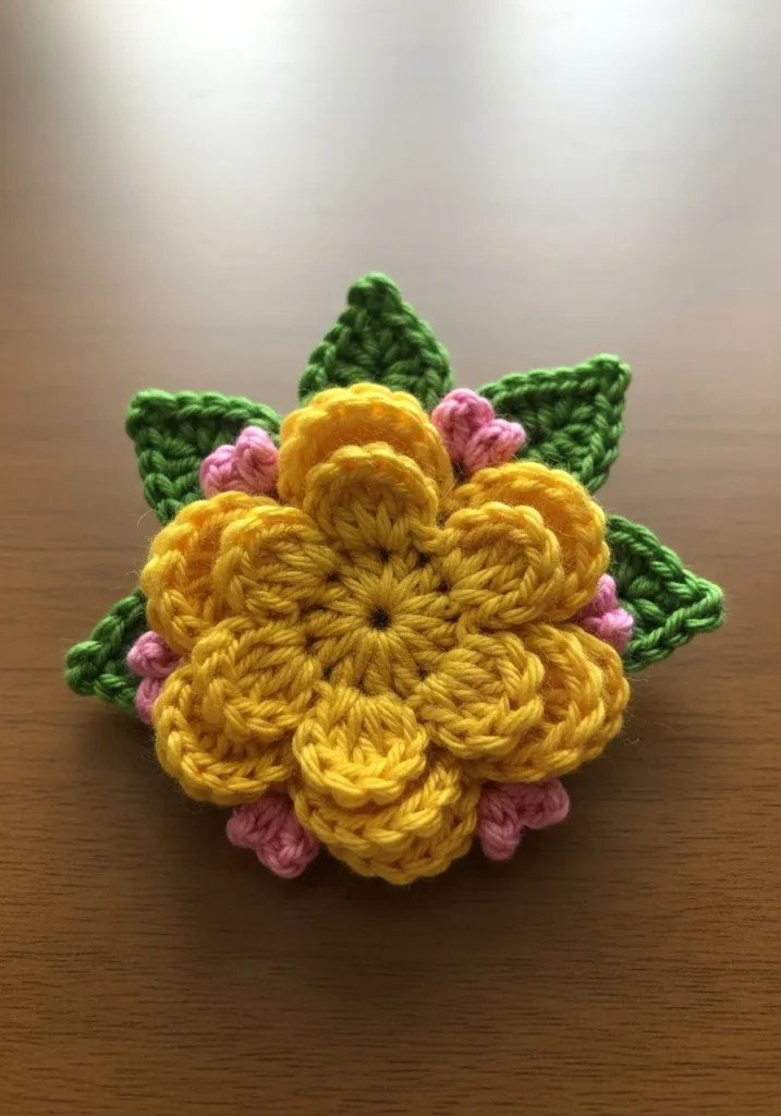This intricate floral piece centers on a large, layered golden-yellow bloom that radiates with a sun-like energy. Each petal is meticulously curved to create a three-dimensional effect, sitting atop a base of deep forest green leaves that provide a sharp, organic contrast. Tucked between the main petals are tiny accents of soft pink, adding a subtle touch of variety to the overall botanical design. The yarn used has a crisp, clean definition, making every individual stitch in the leaves and petals stand out with remarkable clarity.