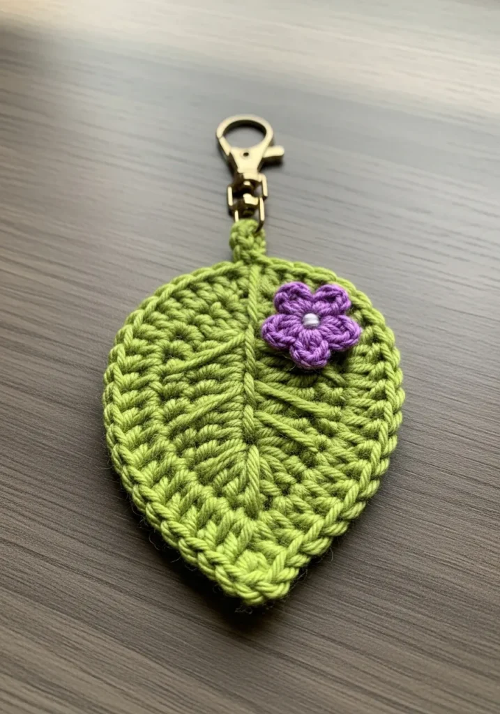 This charming keychain features a lush mossy green leaf base with beautifully textured veins that give it a real botanical feel. The yarn is thick and sturdy enough to handle daily wear on a set of keys or a favorite tote bag. To make things extra sweet, a tiny purple blossom is perched right on top with a dainty pearl center for a little hint of sparkle. It’s finished with a classic brass lobster clasp, which makes it super easy to clip on and go.