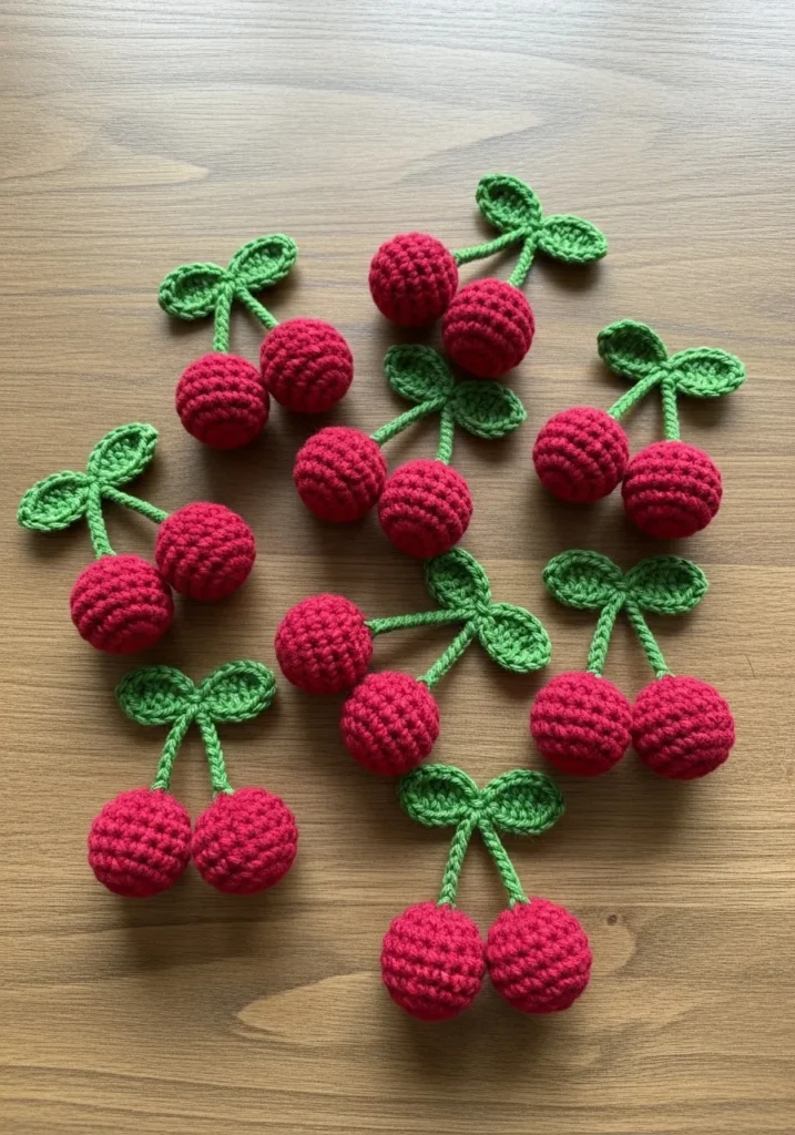 This collection of adorable cherry pairs is worked in a luscious magenta yarn that gives the fruit a ripe, juicy appearance. Each cherry is a perfectly round sphere with a lovely ribbed texture, joined together by a slender grass-green stem and a matching set of delicate leaves. The stitches are incredibly tight and precise, ensuring the cherries hold their plump shape without any stuffing peeking through. These tiny treats are scattered across a wooden surface, showing off their consistent size and vibrant, high-contrast colors.