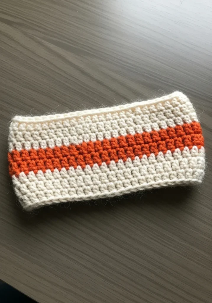 This cozy headband uses a chunky cream yarn with a bold pop of burnt orange right through the center. The stitch work is super tight and clean, which creates a thick, squishy texture that is perfect for chilly morning walks. It has a slightly fuzzy wool blend finish that looks incredibly soft against the skin, and the simple striped design gives it a total vintage athletic vibe. The wide construction ensures your ears stay tucked away from the wind while still looking chic enough for a coffee run.