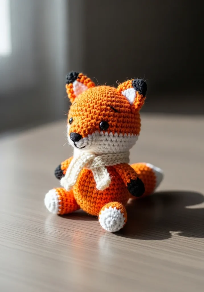 This little forest friend is honestly the cutest thing you will see all day with its bright orange body and snowy white accents. The creator used a very fine yarn to get those tight, neat stitches, which give the fox a smooth and high-quality finish. It has tiny black safety eyes and a delicate hand-stitched nose that brings its little face to life in the sweetest way. To top it all off, the fox is wearing a miniature cream-colored scarf that adds a cozy touch of texture to the overall woodland design.