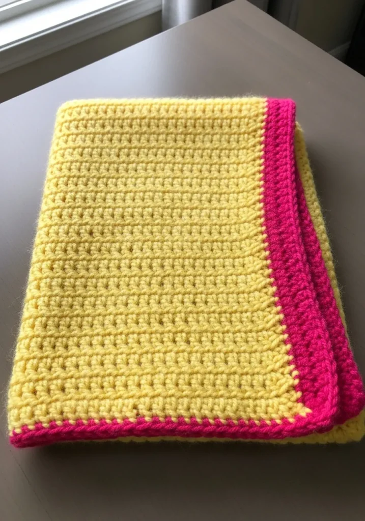 This cheerful blanket is all about high-contrast joy with its buttery yellow main body and a striking hot pink border. The texture is wonderfully consistent thanks to the neat rows of double crochet stitches that create a plush and squishy feel. It is made from a soft acrylic blend that looks both durable and snuggly, which is exactly what you want for something that might see a lot of love. The simple rectangular design is elevated by that bold color choice, making it a modern standout piece for any nursery or living room.