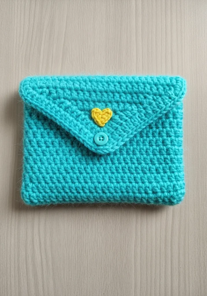 This vibrant teal pouch is the ultimate blend of function and style with its sturdy crochet construction and clean envelope flap. The yarn has a slightly fuzzy texture that feels incredibly soft to the touch while maintaining enough structure to keep your belongings secure. A tiny sunny yellow heart is stitched right onto the center of the flap, just above a matching teal button, which gives the whole piece a polished and thoughtful look. Its compact rectangular shape is perfect for holding a phone or makeup essentials, while the uniform stitches create a beautifully balanced aesthetic.