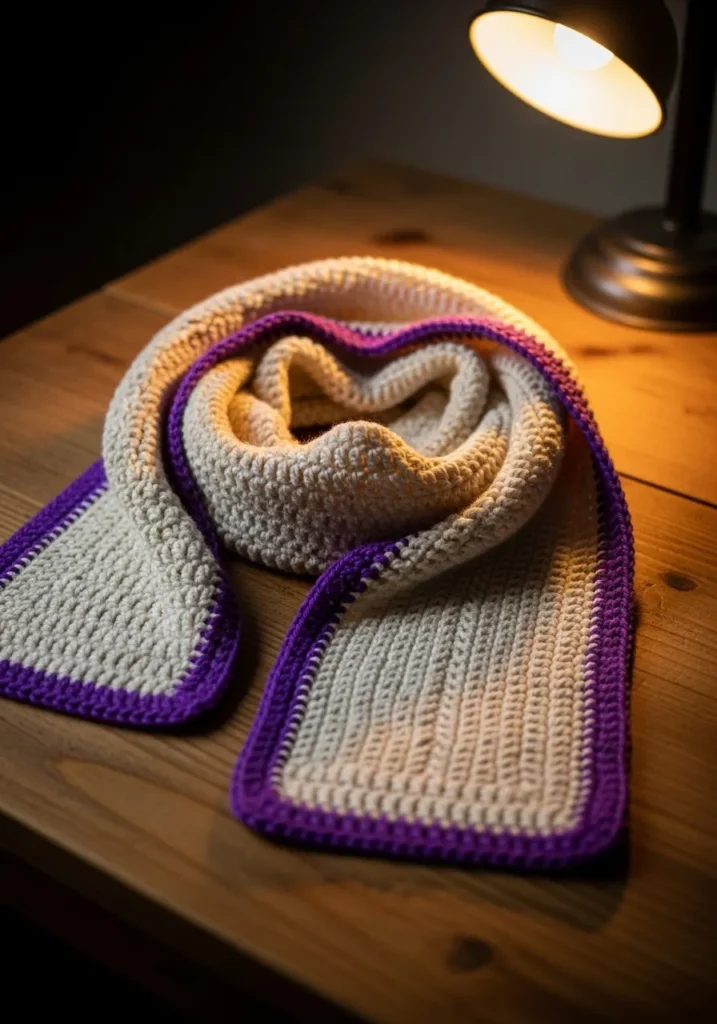 This sophisticated scarf is crafted from a creamy oatmeal-colored yarn that provides a wonderfully neutral and soft base. The design features a delicate lavender purple border that frames the entire piece, giving it a polished and intentional look. Its texture is characterized by neat, vertical ribs that offer a lovely drape and a bit of stretch for maximum comfort. This piece is finished with a simple, clean edge that keeps the focus on the beautiful contrast between the warm cream and the cool purple tones.
