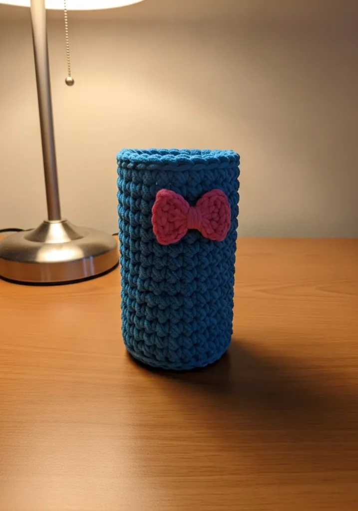 I like this project because it’s a brilliant way to keep your crochet hooks or pens from rolling all over the place. If you’re into quick home decor updates, then you’ll find this incredibly satisfying to finish since the thick yarn makes the rows fly by. I think it’s so fun to play with color combinations that match your office aesthetic, and the little bow just adds that extra bit of flair that makes me smile while I work.