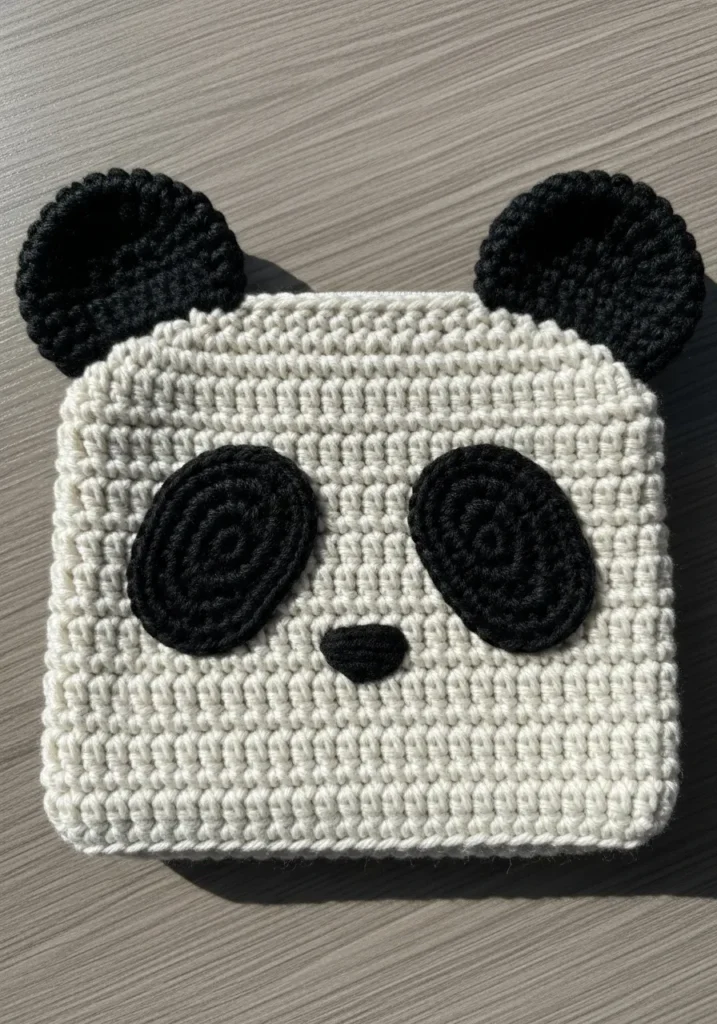 This crochet pouch features an adorable panda face in classic black and white yarn. The square base is worked in a creamy white shade, with round black ears and large oval eye patches stitched onto the front. The facial details are simple but expressive, giving it a sweet and friendly look. The flat shape makes it practical while still standing out visually.