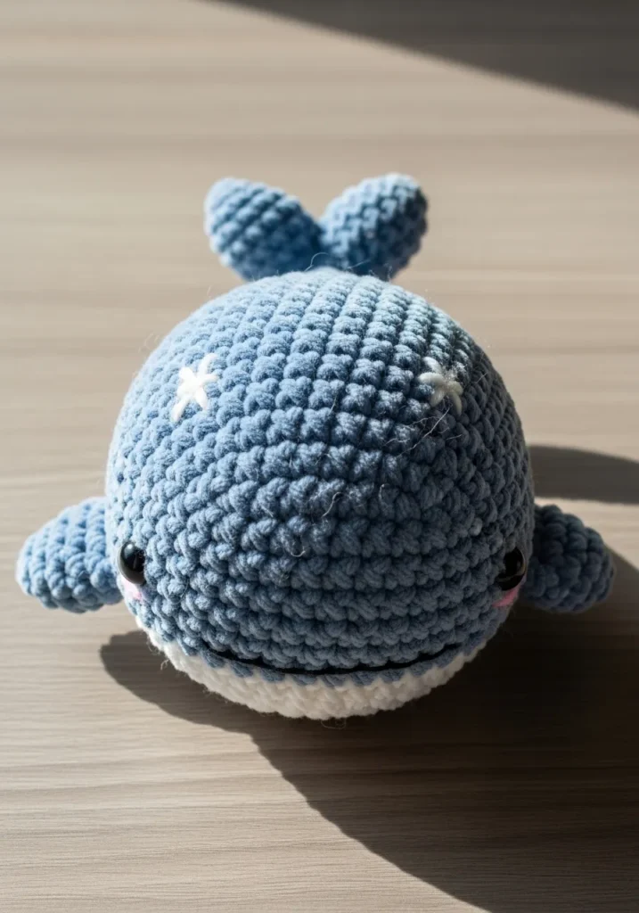 This adorable whale plush is crocheted in a soft sky blue yarn with a creamy white belly that adds a sweet contrast. The body has a rounded, slightly squishy shape with small fins and a tiny tail that give it a playful silhouette. The stitches are thick and visible, creating that cozy handmade texture that makes amigurumi so charming. Its simple embroidered eyes and smooth curves keep the design modern and clean.
