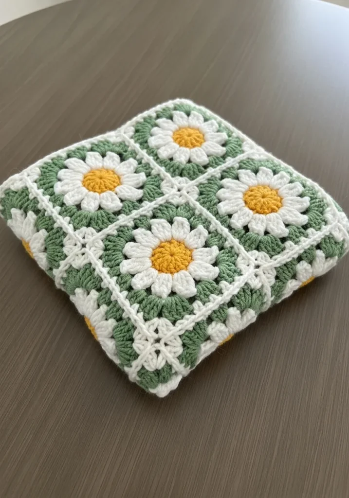 This cheerful granny square features delicate white petals surrounding sunny yellow centers, all framed by a fresh green border. The stitches are neat and slightly textured, giving each square a classic handmade feel. The floral design pops beautifully against the neutral table surface, and the square shape keeps it practical for cups or small decor accents. It feels both vintage inspired and totally on trend.