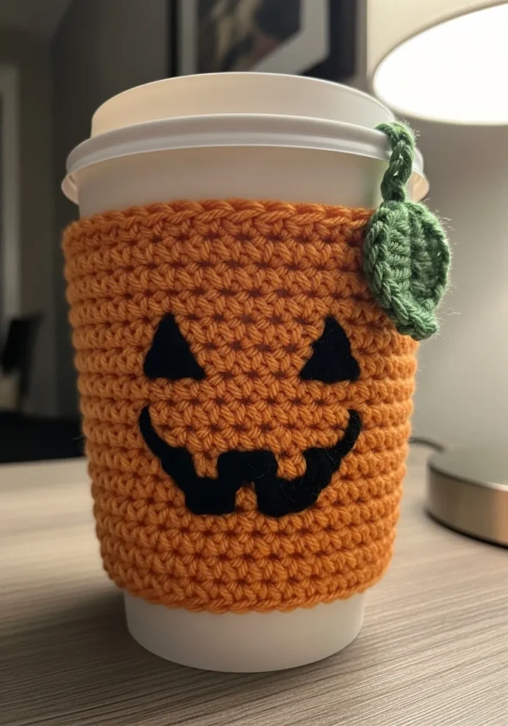This crochet cup cozy is stitched in a rich pumpkin orange with a playful jack o lantern face in black. A tiny green leaf detail near the rim adds a cute finishing touch. The snug fit and textured stitches keep drinks warm while protecting your hands.