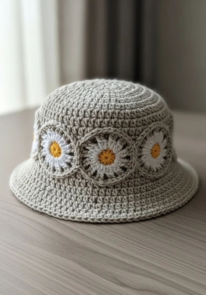 This light gray crochet bucket hat features sweet little daisy appliqués circling the crown, each with a bright yellow center. The smooth, even stitches give the hat structure while keeping it soft and wearable. The floral detail adds charm without overwhelming the clean, modern shape.
