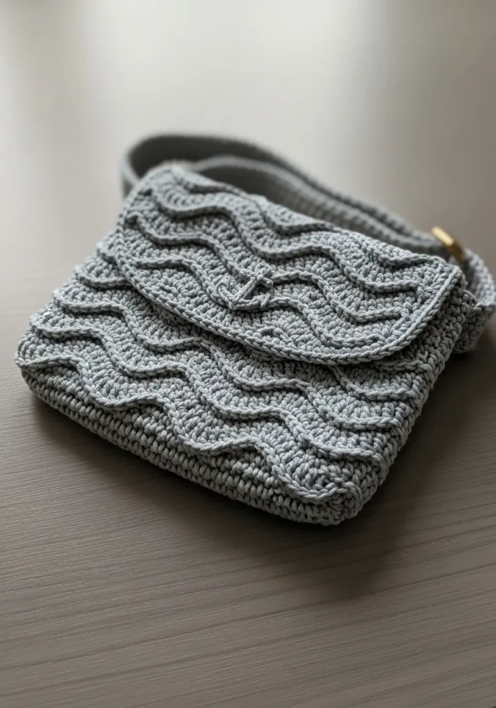 This chic gray crochet sling bag showcases layered wavy stitches across the front, creating a beautiful ripple effect. The structured rectangular shape keeps it practical, and the zipper closure adds a polished finish. The textured rows catch the light in such a pretty way, giving it depth without extra embellishment.