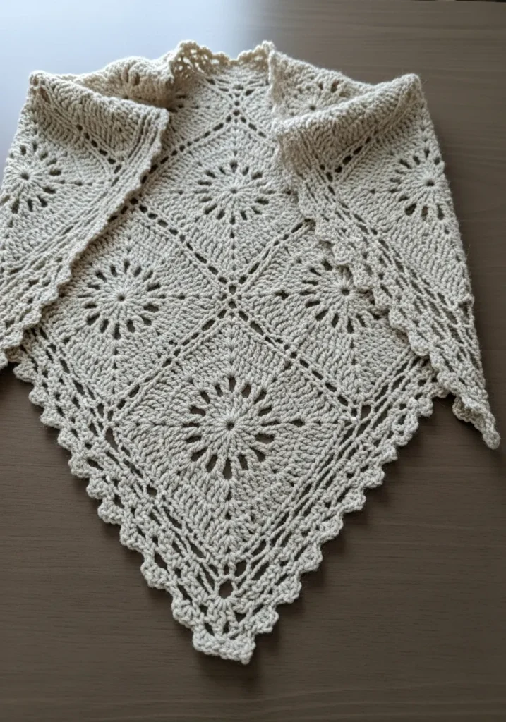 This delicate crochet shawlette is worked in a soft ivory yarn with intricate openwork motifs and scalloped edges. The lace pattern creates a light and airy texture that drapes beautifully, while the pointed triangle shape gives it an elegant silhouette. The detailed stitching makes it look heirloom inspired without feeling old fashioned.