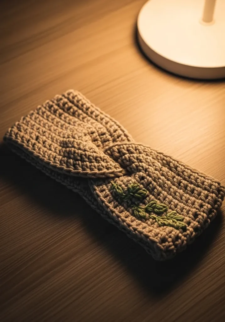 This warm brown crochet ear warmer features a classic twisted front detail and a tiny green leaf appliqué stitched along one side. The ribbed texture gives it stretch and comfort, while the earthy tones keep it modern and wearable. The small decorative touch adds just enough charm without overpowering the clean design.