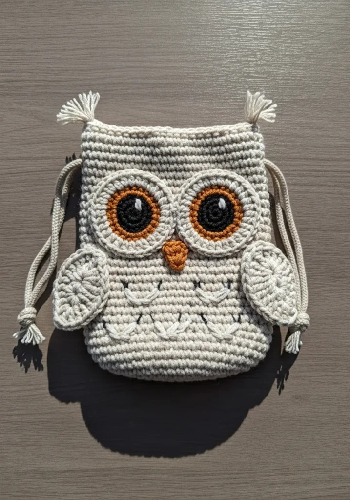 This sweet gray crochet owl pouch features large round eyes, a tiny orange beak, and soft wing details stitched onto the sides. The drawstring closure with tassel ends adds movement and charm, while the sturdy stitches keep it structured. The neutral yarn makes it versatile, and the expressive face gives it personality.