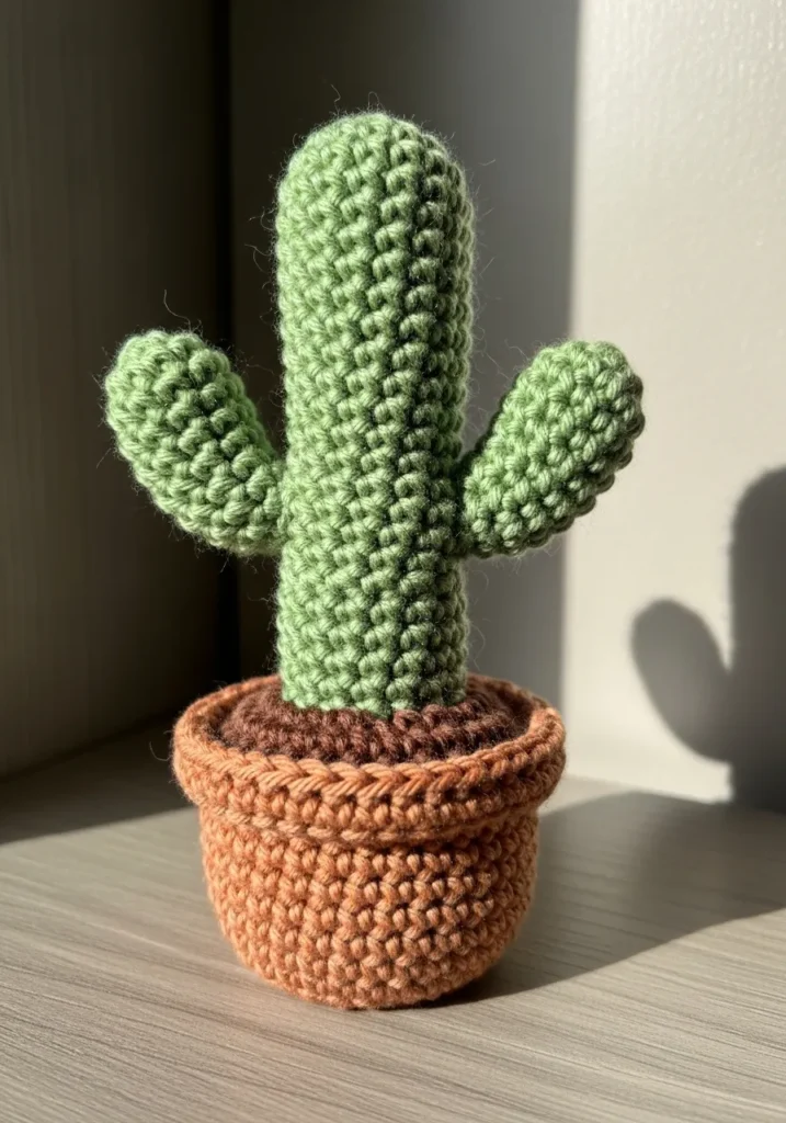 This adorable crochet cactus stands upright in a textured brown pot, with plump green arms and tiny pink blossom details. The tight stitches give it a neat, sculpted look, and the earthy color palette keeps it grounded and stylish. It has all the personality of a real plant without any of the maintenance.