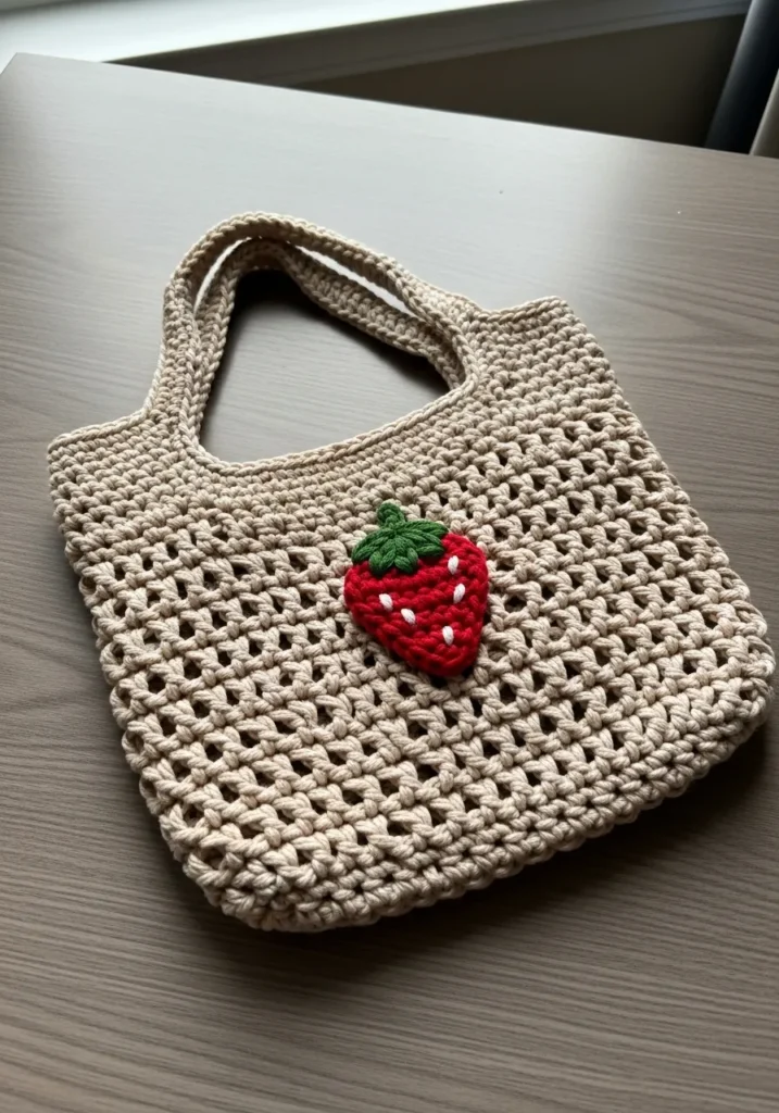 This airy crochet tote is worked in a natural beige yarn with an open mesh pattern and sturdy handles. A bright red strawberry appliqué with green leaves adds a sweet pop of color against the neutral background. The texture is lightweight yet strong, making it both cute and functional.