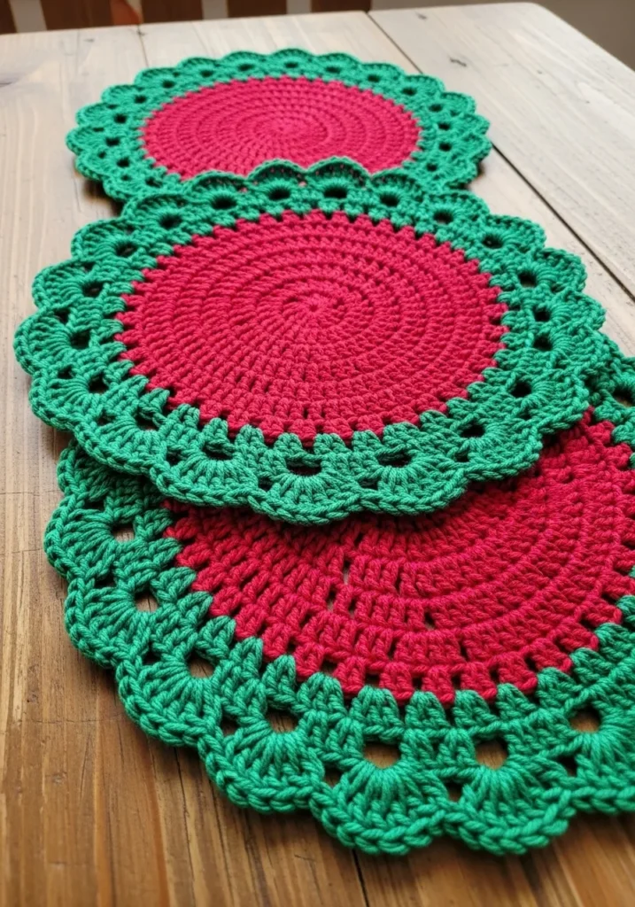 This eye-catching set features a bold cherry red center that radiates outwards into a stunning forest green border. The design is crafted with a meticulous circular stitch pattern that creates a flat and stable surface for your dinnerware. A beautiful scalloped edge adds a touch of intricate detail and a sophisticated lace-like texture to the perimeter. Made with a durable cotton yarn, these mats offer a wonderful weight and a matte finish that looks incredibly elegant on a rustic wooden table. The tight construction ensures they protect your furniture while adding a massive splash of holiday cheer or garden-inspired color to your dining room.