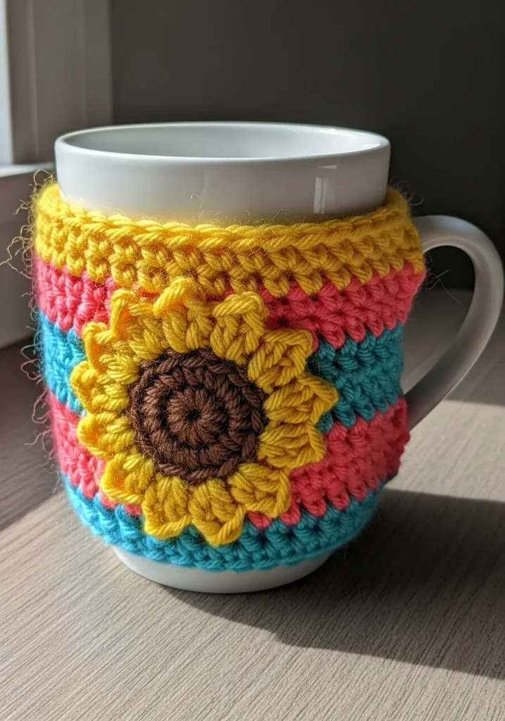 This cheerful little sleeve is a total party for your morning coffee with its vibrant palette of turquoise, coral, and sunshine yellow stripes. The star of the show is a large, textured sunflower appliqué featuring a chocolate brown center and bright yellow petals that pop right off the fabric. It is worked in a sturdy and slightly fuzzy yarn that provides excellent insulation to keep your drink hot while protecting your hands from the heat. The design is tailored to fit snugly around a standard white ceramic mug, leaving plenty of room for the handle to peek out for a comfortable grip.