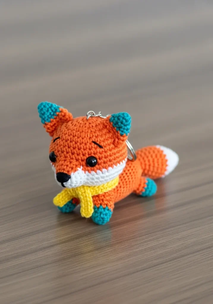 This tiny forest friend is a total showstopper with its vibrant orange fur and playful teal accents on the ears and paws. The miniature fox is crafted using a very fine cotton yarn and incredibly tight stitches to ensure every detail, from the bushy white-tipped tail to the dainty yellow scarf, looks crisp and professional. It features glossy black safety eyes and a small embroidered nose that gives it an irresistible, curious expression. A sturdy silver keychain is securely attached to the top, making it the perfect durable companion for a backpack or a set of keys.