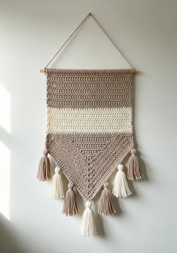 This stunning piece of fiber art brings an instant calm to any room with its creamy white and sandy beige color-blocked design. It features a solid rectangular top worked in a classic double crochet stitch that transitions into a dramatic pointed triangle at the bottom. A row of thick and fluffy tassels hangs from the lower edges, adding a wonderful sense of movement and a soft, touchable texture. The entire piece is suspended from a simple wooden dowel and a matching yarn cord, giving it a clean and modern organic look that fits perfectly in a minimalist or bohemian space.