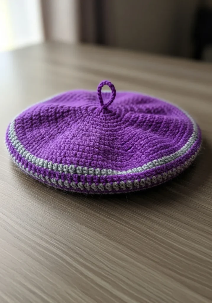 This sophisticated headpiece is a stunning example of how a bold color can elevate a simple, elegant silhouette. The beret is worked in a rich, vibrant purple yarn with a slight halo, suggesting a soft wool or mohair blend that provides both warmth and a touch of luxury. It features a classic circular construction that creates a perfectly slouchy shape, finished with a petite “stalk” or loop at the crown. A contrasting band of silver-gray textured stitches encircles the base, providing a snug fit while adding a modern, sporty edge to the traditional French-inspired design.