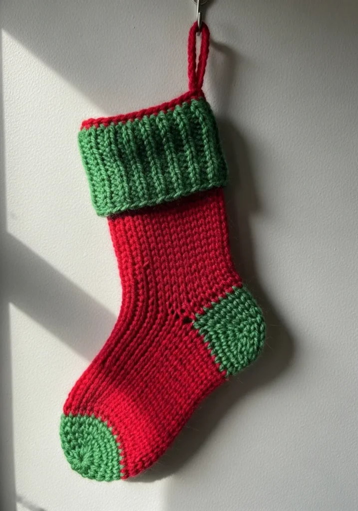 This classic holiday heirloom features a vibrant candy-apple red body that perfectly captures the spirit of the season. The design is accented with a deep forest green on the toe, heel, and a thick, ribbed fold-over cuff that gives it a traditional, high-end feel. It is crafted using a waistcoat stitch (also known as the knit stitch), which provides a dense, sturdy fabric that mimics the look of a knitted stocking while maintaining the strength of crochet. A handy matching red loop is securely attached to the top, making it ready to hang by the chimney with care.