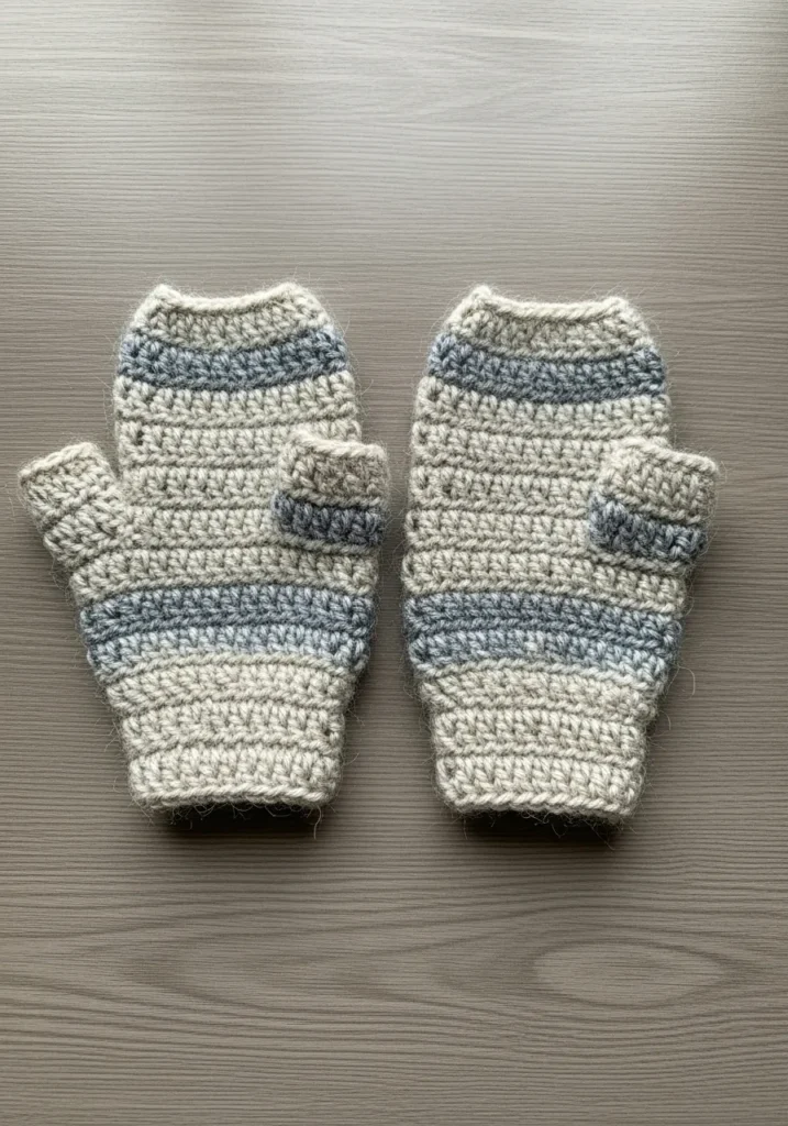 These handy fingerless mitts feature a beautiful blend of oatmeal beige and cool slate gray stripes that give off a total mountain cabin vibe. The texture is wonderfully fuzzy and soft, which suggests a wool or mohair blend that keeps palms toasty while leaving your fingers free to text or sip a latte. Each glove is constructed with sturdy horizontal rows and a snug ribbed cuff at the wrist to ensure they stay perfectly in place. The thumb holes are neatly integrated into the design, making for a seamless and comfortable fit that looks both rugged and stylish.