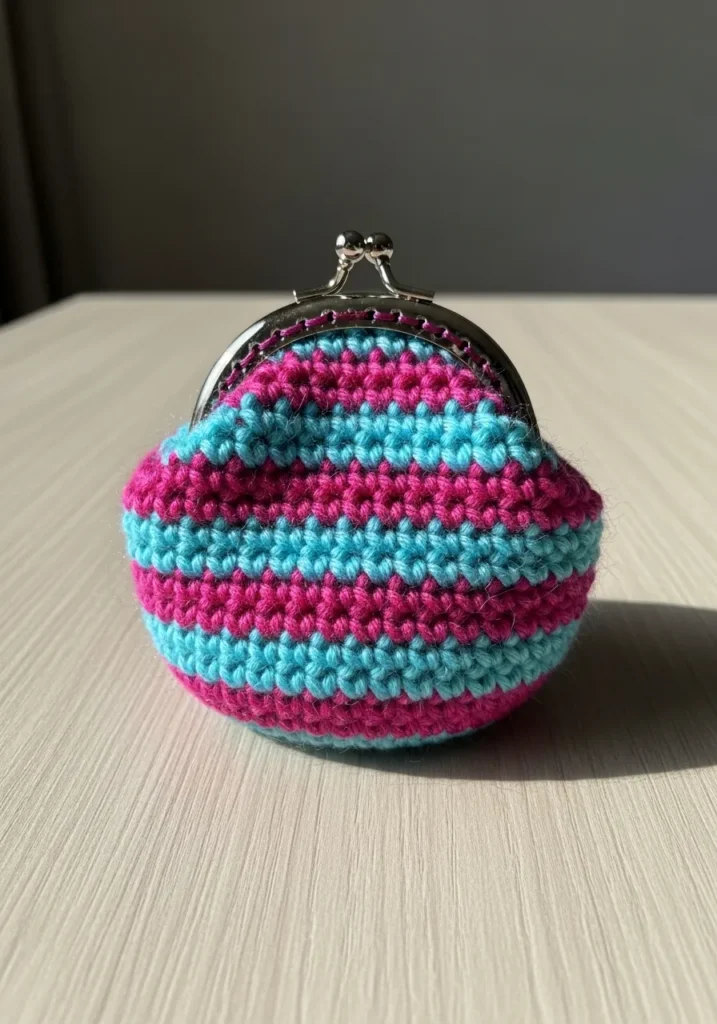 This darling little accessory packs a serious punch with its vibrant alternating stripes of electric magenta and bright teal. The body is worked in a tight and sturdy single crochet stitch, which gives it a firm structure to keep your spare change secure. It features a classic silver metal kiss-lock clasp that adds a touch of vintage charm and a professional finish to the handmade fabric. The rounded bottom creates a cute and plump silhouette that sits perfectly on a tabletop or tucked inside a larger handbag.
