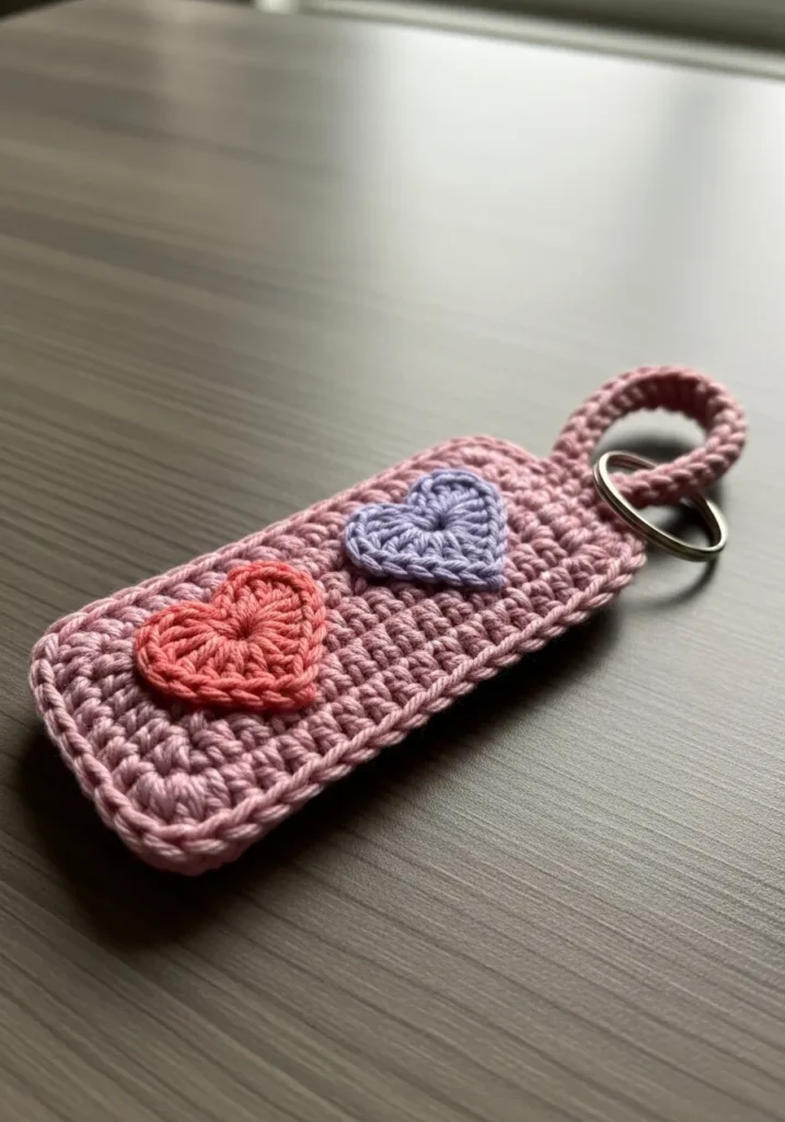 This adorable accessory is a masterclass in combining utility with a sprinkle of charm. The base is a sturdy rectangular strap worked in a tight mauve cotton yarn that feels substantial enough to withstand daily tossing into a crowded handbag. Two dainty puff-stitch hearts in coral and lavender are securely appliquéd onto the surface, giving the piece a delightful three-dimensional pop. A reinforced loop at the top holds a classic silver split ring, ensuring your keys stay put while adding a professional, boutique-quality finish to the overall design.
