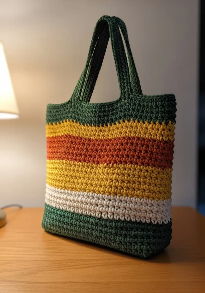 This substantial carryall is a stunning example of how playing with color and stitch density can create a masterpiece. The design features thick, wavy bands of deep evergreen, sunny marigold, rusty terracotta, and crisp cream that give it a wonderful organic feel. It is crafted with a super chunky, cord-like cotton yarn and a popcorn or bean stitch that results in a bubbly, tactile surface that is incredibly durable. The integrated handles are reinforced with tight stitching to ensure this bag can handle heavy loads while maintaining its beautiful, structured shape.