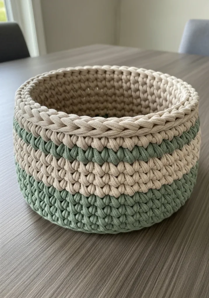 This chic storage solution features a sophisticated palette of muted sage green and warm sandy beige stripes. The basket is worked with a super-thick t-shirt yarn or cotton cord, which gives it an incredibly sturdy and upright structure that won’t flop over. Its design showcases a beautiful waistcoat stitch that mimics the look of knit fabric while providing a dense and durable wall. The rim is finished with a chunky braided edge that adds a high-end touch to the overall organic and minimalist aesthetic.