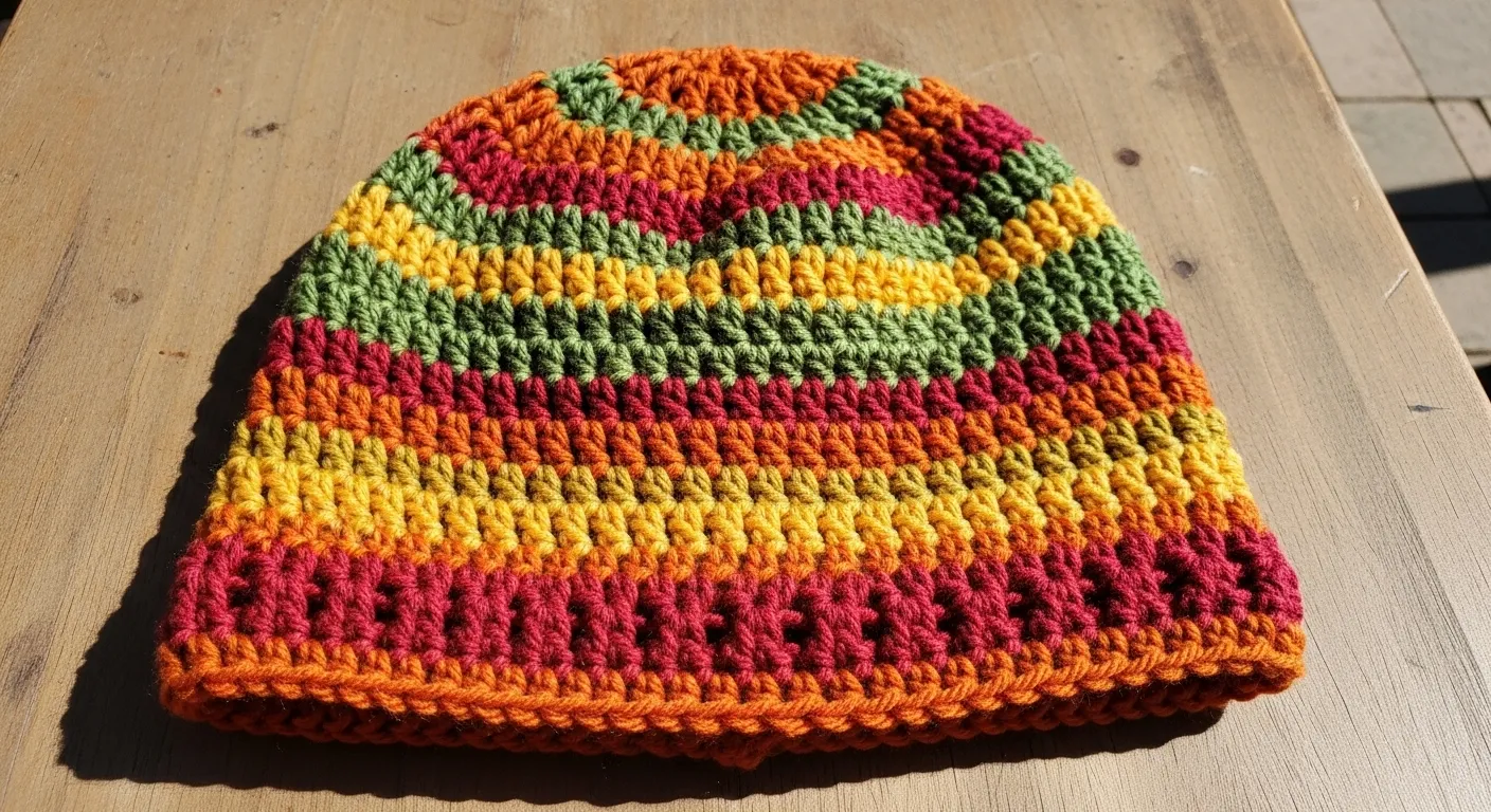 If you are looking for a project that lets you play with every scrap of yarn in your stash, then this beanie is a total dream. No matter your skill level, you can easily master this pattern because it uses basic stitches that work up incredibly fast. I love how these warm tones remind me of a crisp fall walk through the leaves, and it is so fun to see how the next color will change the whole look of the piece. It is the kind of satisfying one-evening project that makes you want to hook up a dozen more in different palettes.